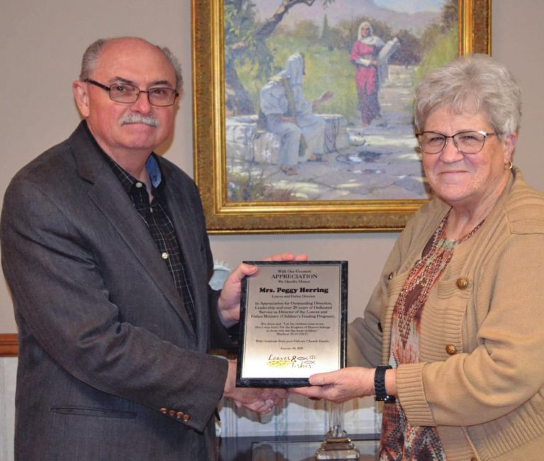 RECEIVES CERTIFICATE OF APPRECIATION - Peggy Herring receives a Certificate of Appreciation from Randy Adams, pastor of Calvary Church located near Clio. The certificate was presented to Mrs. Herring on behalf of the church staff and congregation for more than 20 years of service to the Loaves and Fishes Ministry.