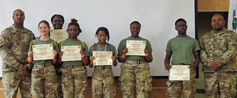 Six cadets from Barbour County High School recently attended the JROTC Leadership Challenge (JCLC), a summer camp program designed to enhance leadership, teamwork, and citizenship skills among Army JROTC cadets. It provides hands-on, physically and mentally challenging environments, where cadets participate in activities like rappelling, obstacle courses, and team-building exercises. JCLC aims to prepare cadets for leadership roles within their JROTC programs and beyond. Cadets showing their course certificates are Anika Williams, Jasiyah Howard, Samaya Eaton, Shyeisha Pearison, Winter Williamson, Zampardi Walton and Jasiyah Howard, who was recognized as Cadet of the Day the first day. Also shown are Army Instructor Chief Warrant Officer II, Kelvin Graham and Army Instructor Sergeant First Class, Steve Fryer.